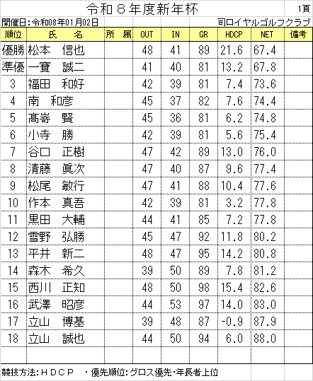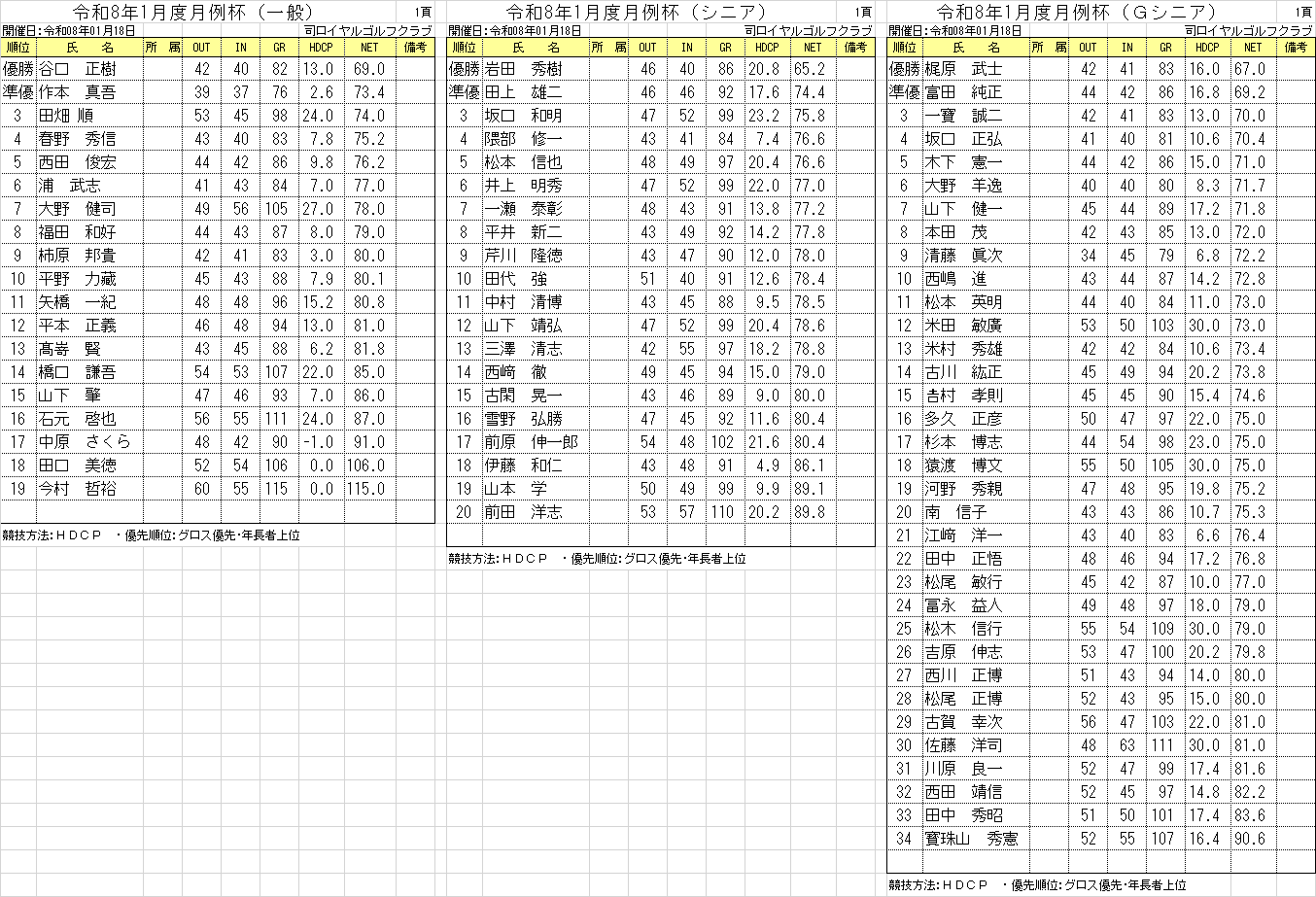 2026.01.18令和8年1月度≪月例杯≫成績表(一般.シニア.Gシニア)
